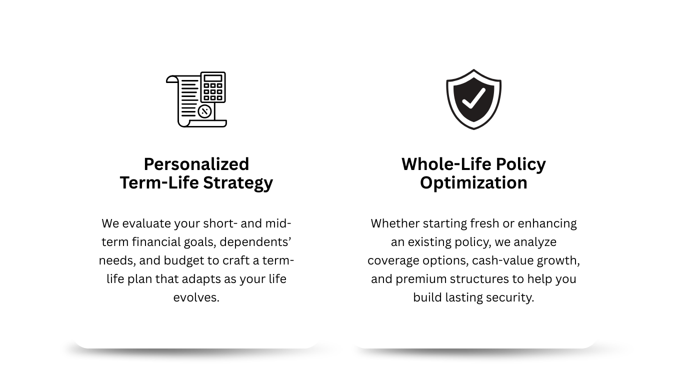 • During a complimentary consultation, we review your financial commitments, life stage, and long-term goals. From there, we outline the benefits of term, whole, or blended solutions so you can choose with confidence.